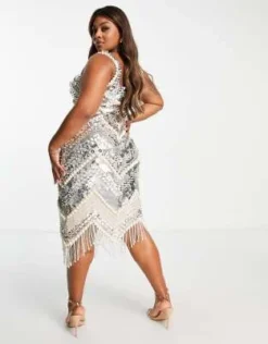 ASOS LUXE Curve – Vestito Corto Nero Con Frange E Scollo Alla Bardot