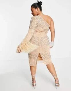 ASOS LUXE Curve – Vestito Midi Monospalla Color Visone Con Decorazioni E Piume Sintetiche Sui Bordi