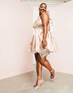 ASOS LUXE Curve – Vestito A Trapezio Corto Jacquard Rosa A Fiori Allacciato Al Collo