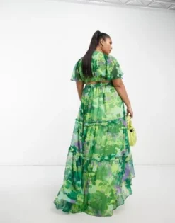 ASOS DESIGN Curve – Vestito Da Giorno Midi In Raso Verde A Fiori Con Bottoni