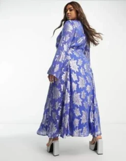 ASOS DESIGN Curve – Vestito Lungo A Maniche Lunghe Blu Metallizzato Con Volant Sui Polsini