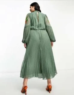 ASOS DESIGN Curve – Vestito Lungo A Pieghe Color Kaki Ricamato Con Inserto In Pizzo