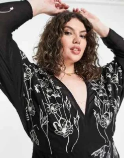 ASOS DESIGN Curve – Vestito Midi Com Maniche A Pipistrello Nero A Fiori Ricamato