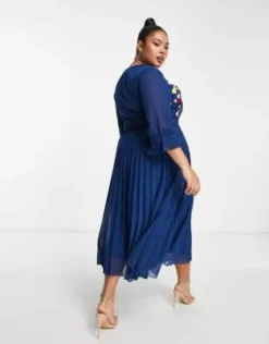 ASOS DESIGN Curve – Vestito Midi Blu Navy A Pieghe Con Ricami E Inserti In Pizzo