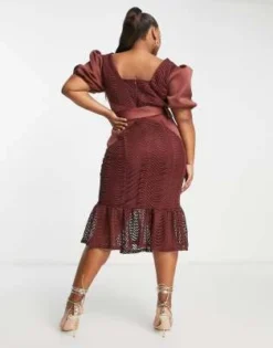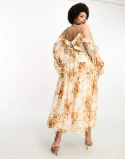 ASOS DESIGN Curve – Vestito Midi Arricciato A Fiori Marroni Con Spalle Scoperte E Volant