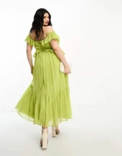 ASOS DESIGN Curve – Vestito Midi Con Spalle Scoperte, Volant E Cut-out Verde Oliva