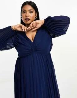 ASOS DESIGN Curve – Vestito Midi Blu Navy A Pieghe Con Scollo Profondo