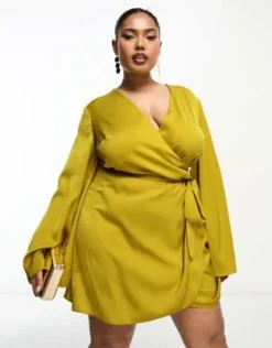 Esclusiva ASOS DESIGN Curve – Vestito Corto A Portafoglio In Raso Oro Allacciato In Vita
