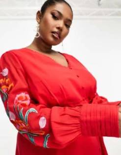 Hope & Ivy Plus – Vestito Corto Ricamato Avvolgente A Maniche Lunghe Rosso