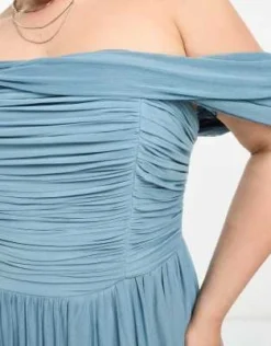 Little Mistress Plus – Vestito Lungo Da Damigella In Rete Blu Raccolta Con Scollo Bardot