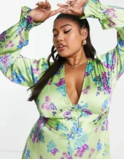 ASOS DESIGN Curve – Vestito Da Giorno Midi In Raso Verde A Fiori Con Bottoni