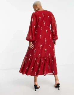 ASOS DESIGN Curve – Vestito Da Giorno Lungo Bordeaux Con Bottoni E Ricami