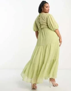 ASOS DESIGN Curve – Vestito Da Giorno Lungo Aperto Dietro Verde Lime Plumetis Con Inserto In Pizzo