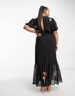 ASOS DESIGN Curve – Vestito Lungo A Balze A Fiori Blu Su Fondo Nero Con Volant