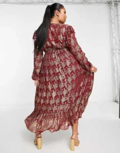 ASOS DESIGN Curve – Vestito Lungo Raccolto In Vita Bordeaux Metallizzato Con Volant