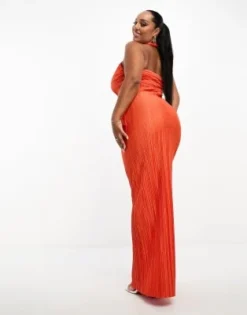 ASOS DESIGN Curve – Vestito Lungo Plissé Arancione Con Scollo Profondo E Allacciatura Al Collo