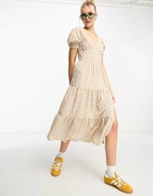 ASOS DESIGN – Vestito Milkmaid Midi Nero E Rosso A Fiori Con Dettagli Arricciati E Maniche Svasate