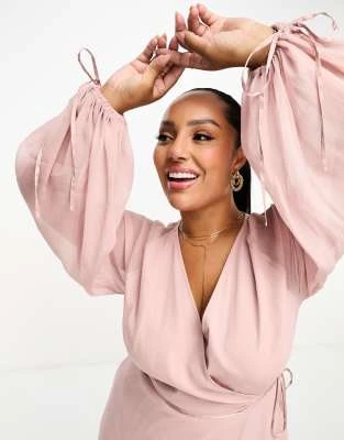 TFNC Plus – Vestito Lungo Da Damigella Rosa Cipria Con Maniche Con Volant