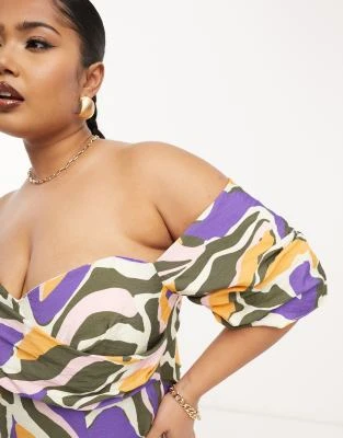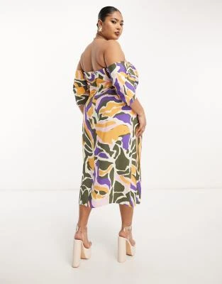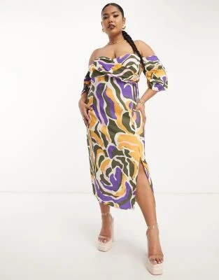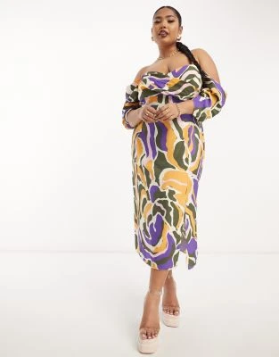 ASOS LUXE Curve – Vestito Midi Decorato Bianco E Blu A Fiori Con Maniche A Sbuffo