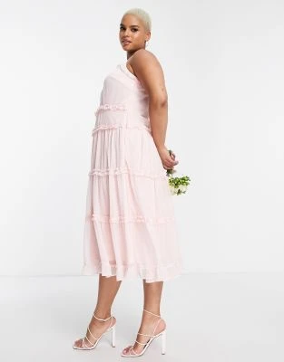 TFNC Plus – Vestito Lungo Da Damigella Rosa Cipria Con Maniche Con Volant