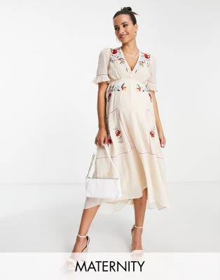 Hope & Ivy Maternity – Vestito Lungo Color Crema Decorato Con Scollo Profondo E Maniche Con Volant