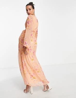 Hope & Ivy Maternity – Vestito Lungo A Portafoglio Verde A Fiori A Contrasto Con Maniche Con Volant