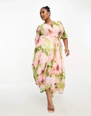 ASOS LUXE Curve – Vestito Midi Decorato Bianco E Blu A Fiori Con Maniche A Sbuffo