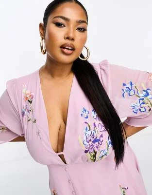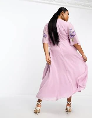Flounce London Plus – Vestito Lungo Con Maniche Con Volant E Scollo Profondo In Raso Rosa Vivace