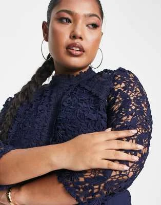ASOS LUXE Curve – Vestito Midi Decorato Bianco E Blu A Fiori Con Maniche A Sbuffo