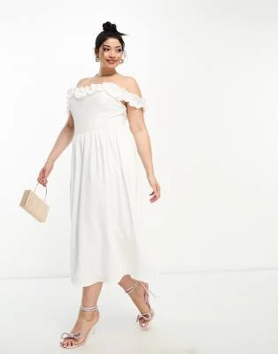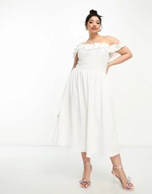ASOS LUXE Curve – Vestito Midi Decorato Bianco E Blu A Fiori Con Maniche A Sbuffo