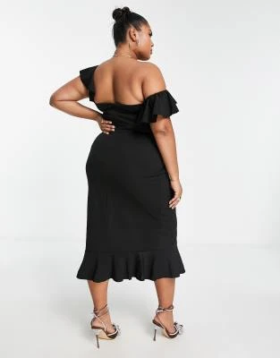 River Island Plus – Vestito Midi Beige Con Volant E Scollo Bardot
