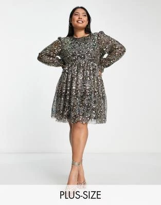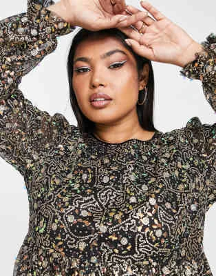 ASOS DESIGN Curve – Vestito Skater Midi Morbido Ricamato Con Godet E Maniche Svasate Nero