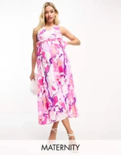 Hope & Ivy Maternity – Vestito Lungo Color Pesca E Ocra A Fiori Con Maniche A Palloncino E Cut-out