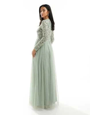 ASOS DESIGN Petite – Vestito Lungo A Pieghe E Balze Verde Salvia Con Scollo Profondo