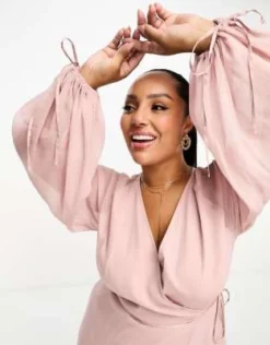 Esclusiva ASOS DESIGN Curve – Vestito Midi A Maniche Lunghe Avvolgente In Chiffon Rosa Polvere