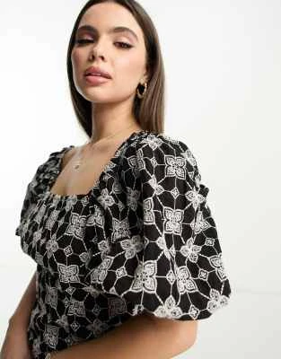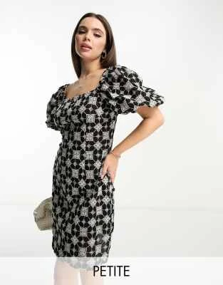 ASOS DESIGN Petite – Vestito Corto Accollato Verde Bosco In Plumetis Con Finiture In Pizzo E Ricamo