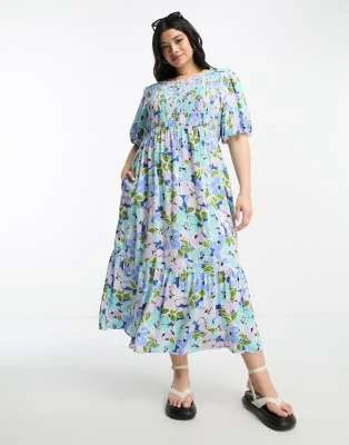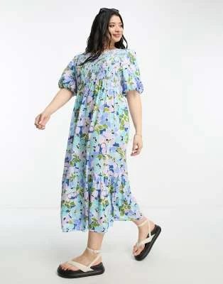 ASOS LUXE Curve – Vestito Midi Decorato Bianco E Blu A Fiori Con Maniche A Sbuffo