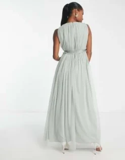 Anaya Petite – Vestito Lungo Da Damigella Verde Salvia Arricciato In Vita Con Scollo A V