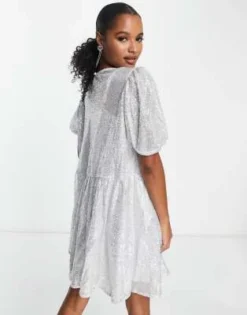 Esclusiva Collective The Label Petite – Vestito Corto Argento Con Maniche A Sbuffo E Paillettes