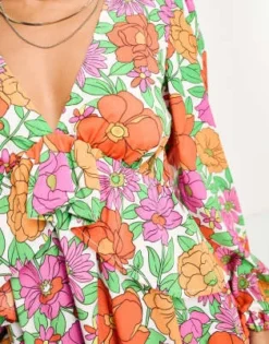 Vila Petite – Vestito Midi A Fiori Grandi E Vivaci Con Maniche A Palloncino E Volant In Vita