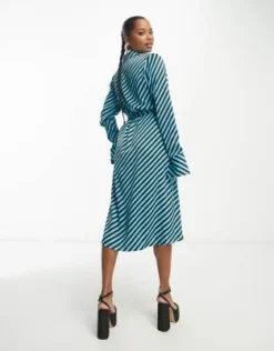 Y.A.S Petite – Vestito Camicia Lungo Allacciato In Vita In Raso Blu A Righe Diagonali