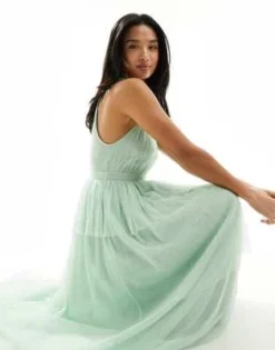 Vila Petite – Vestito Midi Da Damigella In Tulle Verde Menta Con Gonna A Balze Allacciato Al Collo