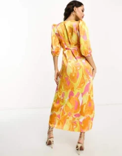 Vila Petite – Vestito Midi A Portafoglio In Raso Testurizzato Arancione Con Stampa Astratta