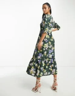 Nobody’s Child Petite – Esme – Vestito Midi Con Dettaglio Laccetti Sulle Maniche Verde A Fiorellini