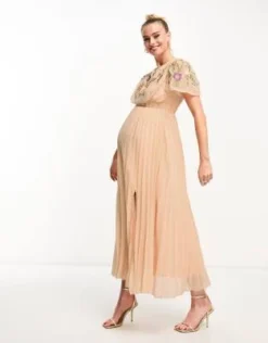 ASOS DESIGN Maternity – Vestito Lungo Accollato Con Allacciatura In Vita E Ricamo Stencil Floreale