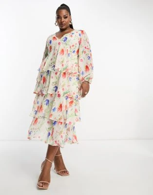 River Island Plus – Vestito Midi Beige Con Volant E Scollo Bardot