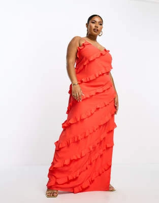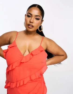River Island Plus – Vestito Midi Beige Con Volant E Scollo Bardot