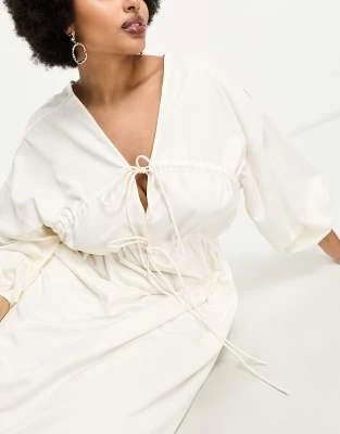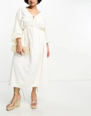 River Island Plus – Vestito Midi Beige Con Volant E Scollo Bardot