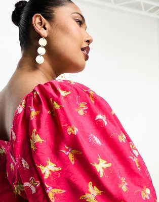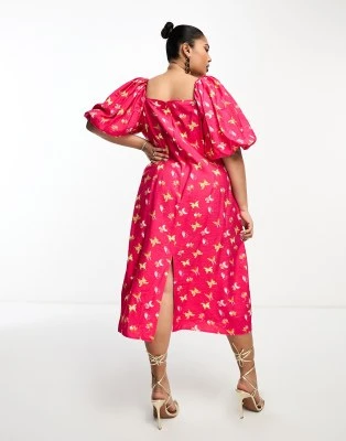 Flounce London Plus – Vestito Lungo Con Maniche Con Volant E Scollo Profondo In Raso Rosa Vivace
