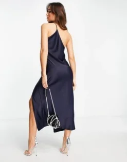 ASOS DESIGN – Vestito Monospalla In Raso Con Gonna Al Polpaccio E Retro Drappeggiato Blu Navy